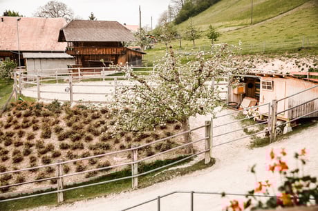 Sehr bewährt hat sich in der Praxis unser dreiteiliger Auslauf mit verschiedenen Belägen. Das heisst der Boden besteht aus Sand, Verbundsteinen, Kies und sorgt gleichzeitig für einen natürlichen Abrieb der Hufe. Unsere Pferde sind, mit Ausnahme einer langjährigen Pensionärin, alle barhuf. Bäume und Hecken sind gern benutzte Schattenspender.